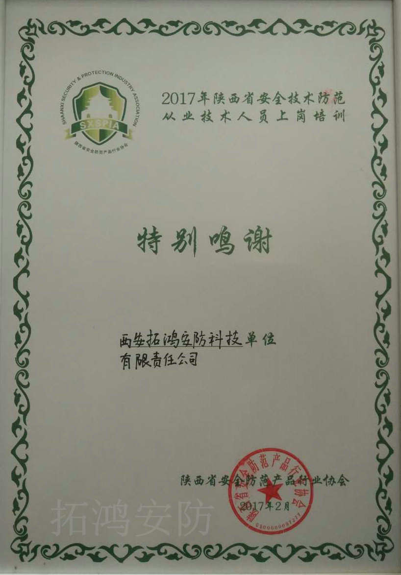 經(jīng)過培訓(xun)後安全防範(fàn)産品行業協(xié)會此證書是我(wo)公司貳級工(gōng)程資質(zhi)證年審、升級(ji)的必備(bèi)證件。